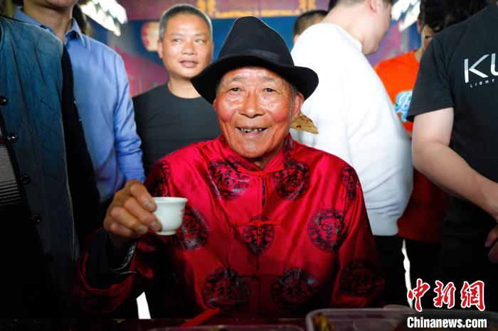 只見“酒醉公”身著紅色唐裝,頭戴禮帽,右手舉著一只面棰,用紅紙包著,寫有“早生貴子”4個字。他逐一“打”前一年剛結(jié)婚的“新郎官”,從他們的左肩上輕輕滾打而下,再從下滾打上右肩,邊滾打,邊講些祝愿他們夫婦新婚添丁、幸福美滿的吉祥話。