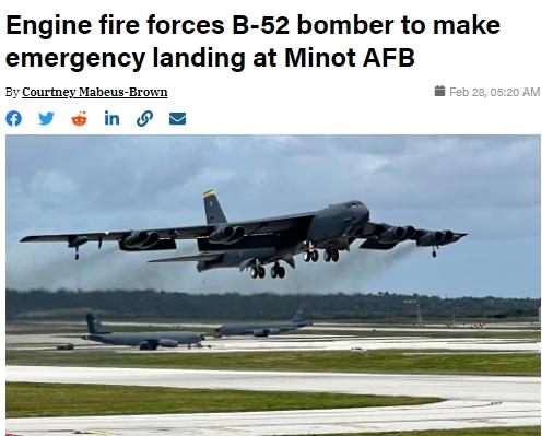 據(jù)報道,當(dāng)天,美國邁諾特空軍基地發(fā)言人稱,當(dāng)?shù)貢r間23日,一架B-52H型戰(zhàn)略轟炸機從該基地起飛,一臺發(fā)動機在空中起火,隨后被迫緊急降落該基地。報道稱,飛機著陸后,火被撲滅,機組人員沒有傷亡。