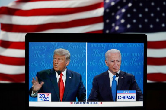 這張2020年10月22日在美國弗吉尼亞州阿靈頓拍攝的視頻畫面顯示,時任美國總統(tǒng)特朗普(左)與當時的民主黨總統(tǒng)候選人拜登在田納西州納什維爾市參加最后一場總統(tǒng)候選人電視辯論。新華社記者 劉杰 攝