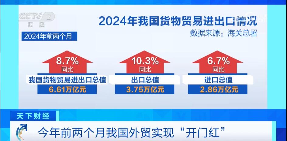 央視網(wǎng)消息:海關(guān)總署3月7日發(fā)布,今年前2個月,我國貨物貿(mào)易進出口同比增長8.7%,出口更是達到兩位數(shù)增長,外貿(mào)實現(xiàn)“開門紅”。
