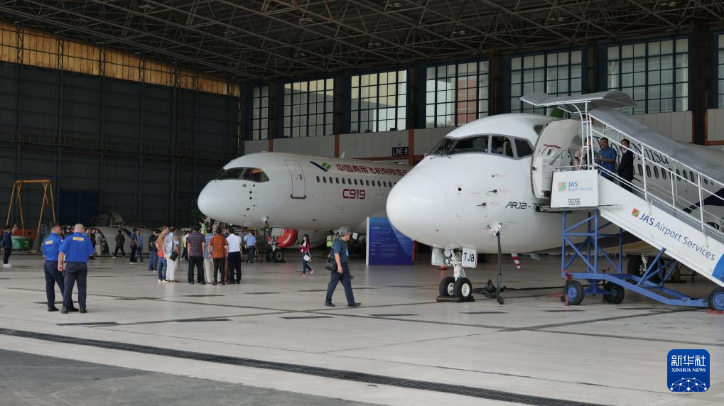 3月10日,中國商飛ARJ21(右)和C919飛機在印度尼西亞首都雅加達蘇加諾-哈達國際機場機庫作靜態(tài)展示。新華社記者 葉平凡 攝