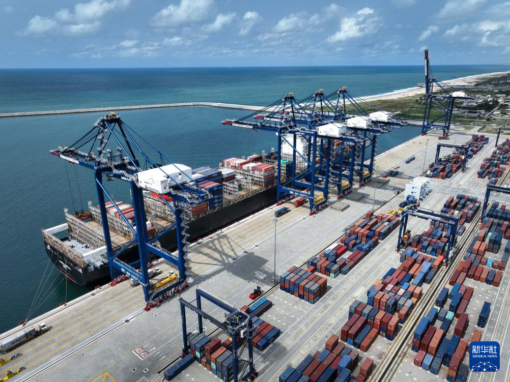 3月11日,一艘貨輪在尼日利亞拉各斯萊基深水港裝卸集裝箱(無人機照片)。新華社發(fā)(萊基港公司供圖)