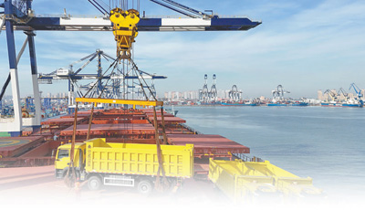 一批工程車輛在山東港口煙臺港裝入中非班輪,將發(fā)往幾內(nèi)亞馬瑞巴亞港,投入當(dāng)?shù)鼗A(chǔ)設(shè)施建設(shè)。