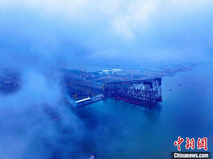 3月12日,亞洲第一深水導(dǎo)管架“?;枴痹趶V東珠海建造完工。這是“海基二號”導(dǎo)管架裝船后全景。(中國海油供圖)
