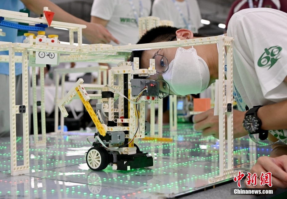 資料圖:一名學(xué)生在觀摩自己設(shè)計(jì)編程的機(jī)器人。中新社記者 侯宇 攝
