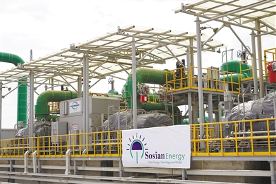由中國企業(yè)承建的肯尼亞索西安地熱電站于去年6月底投產(chǎn)送電,成為非洲首個從設(shè)計、產(chǎn)品生產(chǎn)到建設(shè)、調(diào)試完全由中國企業(yè)獨立完成的地熱發(fā)電站。該電站設(shè)計裝機容量35兆瓦,每年可減少二氧化碳排放24萬噸。圖為索西安地熱電站2號發(fā)電機組。