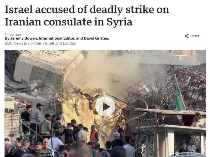 報道援引伊朗駐敘利亞大使侯賽因·阿克巴里的話稱,伊朗大使館旁邊的領(lǐng)事部門建筑“遭到以色列F-35戰(zhàn)機發(fā)射的六枚導(dǎo)彈襲擊”。伊朗媒體發(fā)布的視頻還顯示,現(xiàn)場遭到嚴(yán)重破壞,并起火冒煙。