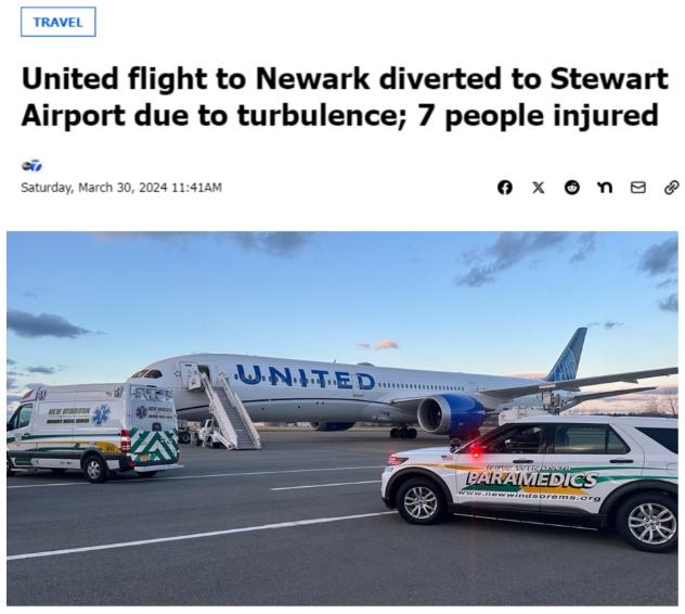 據(jù)報道,執(zhí)飛這一航班的機型為波音787,原計劃從特拉維夫飛往新澤西州紐瓦克國際機場,機上有300多名乘客和機組人員。當(dāng)天下午約6:45,由于準備降落時突遇“大風(fēng)和湍急氣流”,飛機改道飛往紐約斯圖爾特國際機場。
