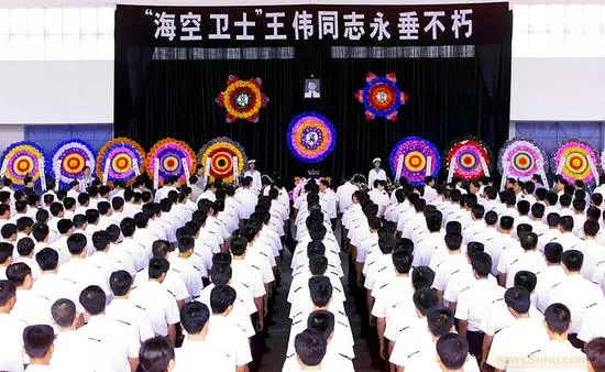 2001年4月26日,海南三亞,海軍舉行海上祭奠“??招l(wèi)士”王偉烈士活動(dòng)。