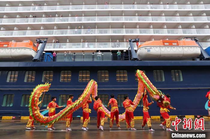 歡騰的舞龍舞獅歡迎“邁希夫”號郵輪到訪上海吳淞口國際郵輪港。蔣小威攝
