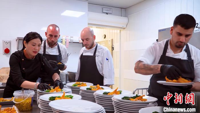 2024年2月22日,夏蓉(左)與巴塞羅那洲際酒店的廚師團(tuán)隊合作為宴會制作中餐。受訪者供圖