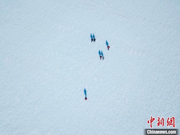 藍(lán)冰上的科學(xué)家、野外向?qū)Ш陀浾?。照片攝于智利南極研究所(INACH)2022年對南極洲埃爾斯沃斯山脈聯(lián)合冰川的實(shí)地考察(圖片來自智利圣地亞哥大學(xué)Jose Jorquera)。施普林格·自然/供圖