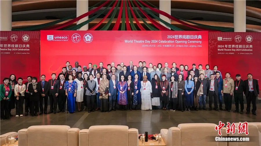 2024年3月27日,在河北廊坊參加2024年世界戲劇日慶典活動(dòng)的中外嘉賓合影留念?;顒?dòng)主辦方供圖