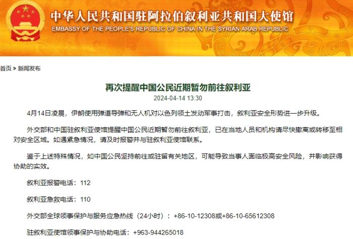 使館消息稱(chēng),4月14日凌晨,伊朗使用彈道導(dǎo)彈和無(wú)人機(jī)對(duì)以色列領(lǐng)土發(fā)動(dòng)軍事打擊,敘利亞安全形勢(shì)進(jìn)一步升級(jí)。