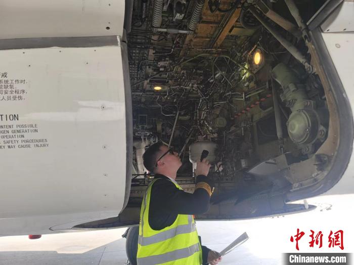 蘇馬耶夫·馬克西姆在做飛行前的檢查工作。中新社記者阿琳娜攝