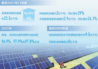 近年來,我國風(fēng)電、光伏等可再生能源裝機規(guī)模持續(xù)擴大。截至2021年11月底,全國發(fā)電裝機容量約23.2億千瓦,同比增長9%。其中,風(fēng)電裝機容量約3億千瓦,同比增長29%;太陽能發(fā)電裝機容量約2.9億千瓦,同比增長24.1%。