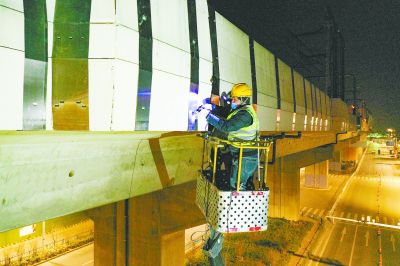 寧和城際高架橋護欄板加固工程施工現(xiàn)場。 南報融媒體記者 段仁虎攝