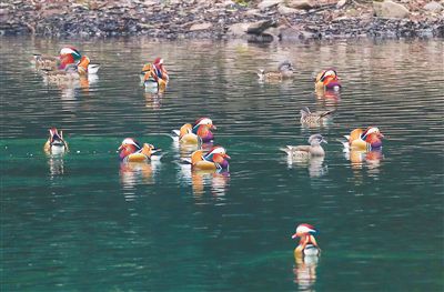 據(jù)了解,鴛鴦隸屬于雁形目鴨科鳥類,是國家二級重點保護野生動物。鴛指雄鳥,鴦指雌鳥,鴛鴦屬于合成詞,常被人們用來比喻愛情。鴛鴦主要棲息于山地森林河谷、葦塘沼澤以及開闊的湖泊、江河等處,生性機警、極善隱蔽,聽覺、視覺都很敏銳,飛行本領(lǐng)也很強。每年9月至10月鴛鴦會南下越冬,常呈10只左右小群遷飛,有時也會有50余只的大群。