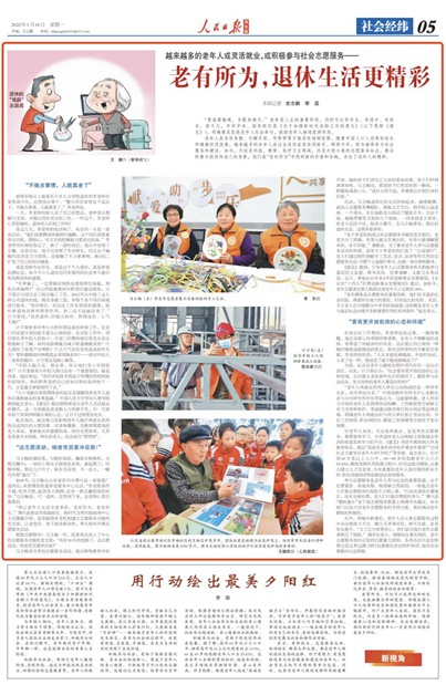 老年人在言傳身教、化解矛盾、傳幫帶等方面具有獨特優(yōu)勢。隨著中國人口人均壽命延長和健康狀況改善,越來越多的老年人由過去退休在家休閑娛樂、頤養(yǎng)天年,轉(zhuǎn)為繼續(xù)參與社會服務和建設。如今,無論是科技、教育、醫(yī)療衛(wèi)生領域,還是大街小巷的志愿服務站點,都活躍著大批退休老人的身影,他們在“老有所為”中找到新的價值和樂趣,活出了老年人的精彩。