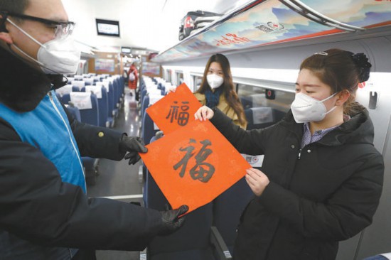 昨天5時(shí)34分,北京地區(qū)首趟春運(yùn)高鐵G6737次列車(chē)發(fā)車(chē),列車(chē)員將精心準(zhǔn)備的福字送給旅客。本報(bào)記者 安旭東攝