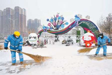 昨天,京城再度飄雪,在東六環(huán)西側路冬奧主題花壇附近步道上,環(huán)衛(wèi)工在清除步道積雪。本報記者 方非攝