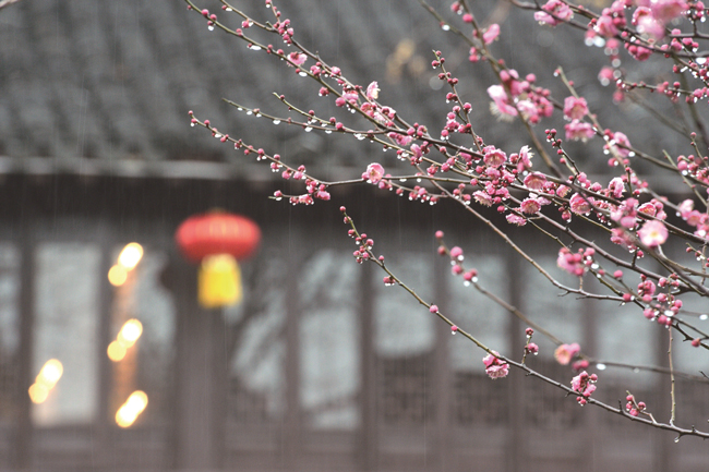 1月23日下午,嘉興市區(qū)梅灣街,冬雨中幾株紅梅迎春開放,競相爭艷。(徐志達)