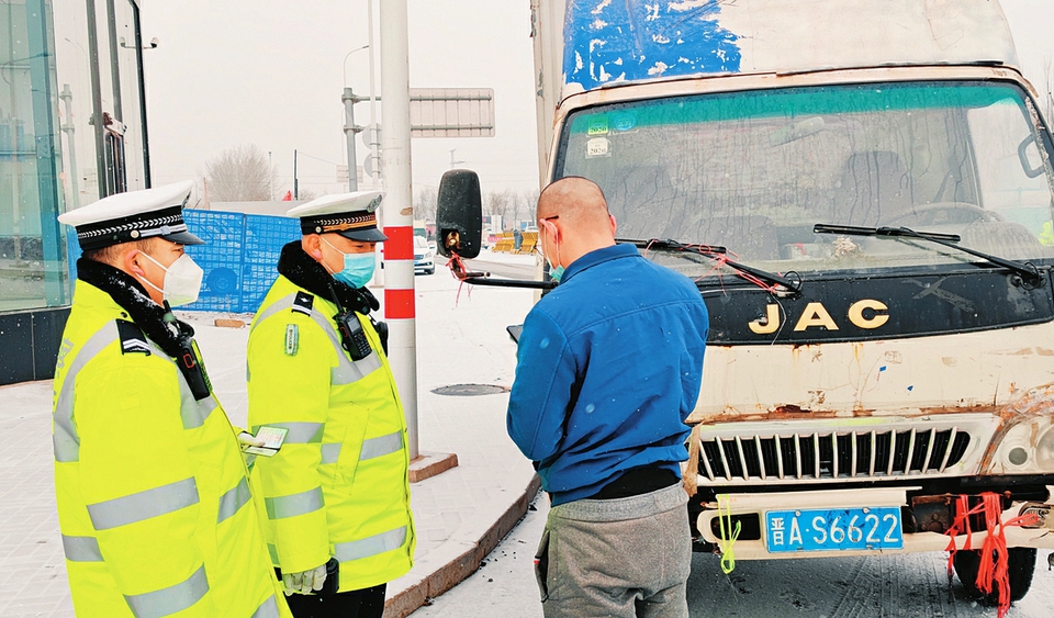 由于連日下雪,為有效預防道路交通事故的發(fā)生,太原鐵路公安處交警支隊及時啟動惡劣天氣應急預案,全員上崗,積極應對降雪天氣,確保旅客“春運”平安出行。圖為1月24日,民警上街排查交通安全隱患。(成鵬攝)