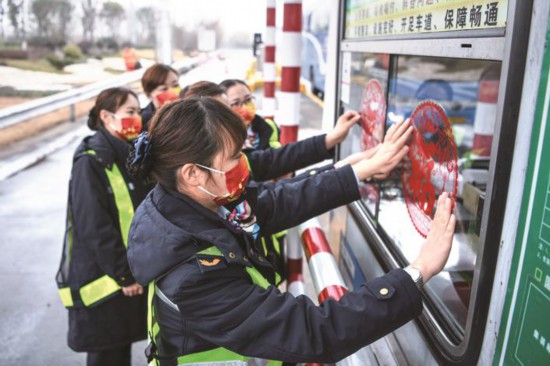 1月24日,在嘉興高速南湖收費(fèi)站,南湖“紅船”巾幗服務(wù)隊的收費(fèi)員們裝扮著收費(fèi)站,向排隊等候取卡的駕駛員發(fā)放“?!弊?、防疫包和車載垃圾袋,送上一份暖暖的關(guān)愛。春節(jié)期間,收費(fèi)員們將堅守崗位,用微笑服務(wù)春運(yùn),為高速公路暢通保駕護(hù)航。(王振宇)