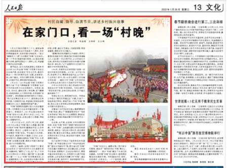 1月25日至26日,農(nóng)歷小年之際,國家公共文化云推出“村晚”接力云展播,集中展示《我的“村晚”我的年》融媒體節(jié)目,以及來自內(nèi)蒙古、黑龍江、上海等20個?。▍^(qū)、市)的30場精彩“村晚”活動。節(jié)目通過文化傳承、時代新風(fēng)、展望未來3個篇章,以訪談、互動、游戲等方式,展播各地特色“村晚”節(jié)目、分享“村晚”臺前幕后故事、展現(xiàn)鄉(xiāng)村振興美好畫卷、推介鄉(xiāng)村美景好物。