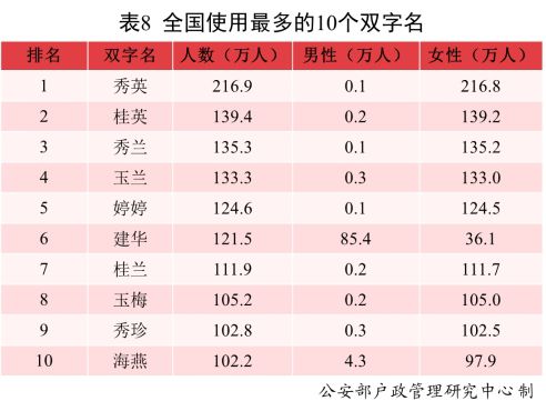 全國戶籍人口中,使用頻率最高的10個(gè)雙字名依次為:秀英、桂英、秀蘭、玉蘭、婷婷、建華、桂蘭、玉梅、秀珍、海燕。其中“秀英”名列榜首,使用人數(shù)為216.9萬。
