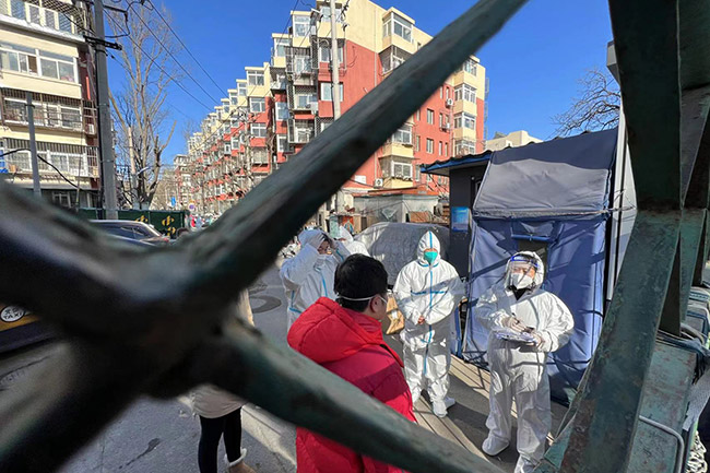 1月25日早8點,室外氣溫低于零度,而今日的大風(fēng)天氣更降低了體感溫度。在小區(qū)門口,街道和社區(qū)的“大白”們早已就位,在管控區(qū)外值守并隨時準(zhǔn)備為身體不便的居民進(jìn)行入戶核酸檢測工作。