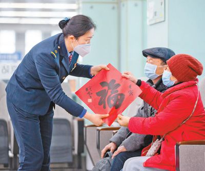 春運(yùn)期間,南京火車(chē)站從細(xì)節(jié)著手、小事出發(fā),推出了一系列溫馨服務(wù)?!?58”雷鋒服務(wù)站購(gòu)置一批適合兒童使用的口罩,教孩子們?nèi)绾握_佩戴,同時(shí)為乘車(chē)旅客送上春聯(lián)、窗花或“?!弊?。圖為“158”雷鋒服務(wù)站客運(yùn)值班員為旅客送上新春祝福。