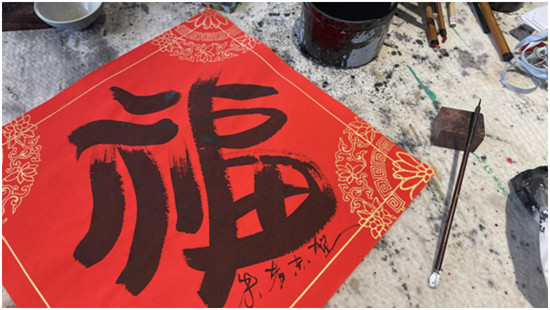 朱者赤是去年7月入駐藝術(shù)村的自由職業(yè)藝術(shù)家,今年,他決定留在林家村過年,他希望以送“?!钡姆绞絹肀磉_自己真摯的祝福,與村民們一起歡度春節(jié)。581幅各不相同的藝術(shù)“福”字,正是他送給村中581戶家庭的新年禮物。“入駐半年來,政府部門的關(guān)心幫助和支持與村民們熱情地問候讓我非常感動,我懷著感恩的心情,寫下這581個創(chuàng)意福字?!敝煺叱嗾f。