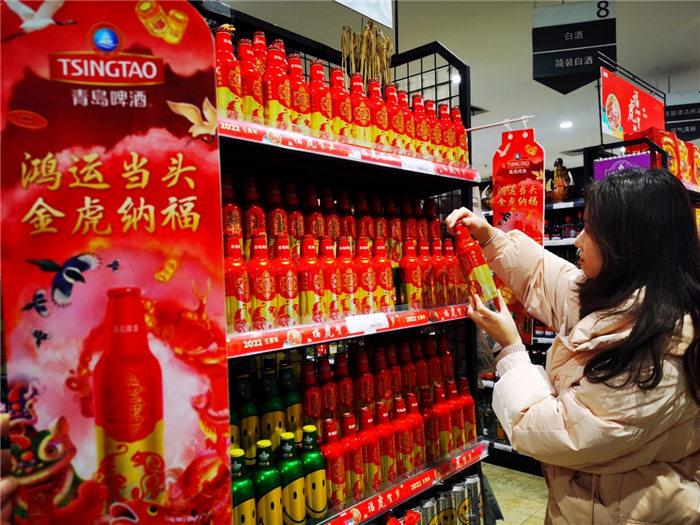 年味不僅是物質(zhì)上的豐富,也有文化上的追求?!斑^年就買‘鴻運當頭’,圖個好彩頭。”消費者王先生每年過年都會“鴻運當頭,先囤一波”,作為年夜飯的“必選項”?!澳暌癸埍仨毤t紅火火,不管是名字還是包裝,鴻運當頭就是喜慶,而且酒也好喝,每年還出不同的生肖版,我都收藏著著呢?!痹S多消費者表示,這款青島啤酒成為春節(jié)當之無愧的“鴻運”年貨,走親訪友拎上一提,年味就出來了。