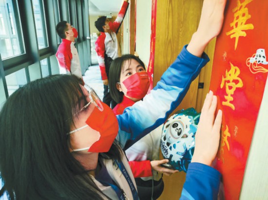 服務(wù)保障人員的村內(nèi)生活也趣味十足。下午3點(diǎn)多,一場(chǎng)“守海陀歲·延慶冬奧村新村民共贏未來(lái)”主題活動(dòng)在訪客中心舉行?!拔⑿Φ难?,為大地開花;愛(ài)灑向手心,純潔無(wú)瑕……”中外志愿者們用12種語(yǔ)言唱起北京冬奧會(huì)志愿者之歌《燃燒的雪花》,擊鼓傳花,匿名交換明信片,現(xiàn)場(chǎng)溫馨又熱鬧。而在媒體中心,志愿者寫福字,貼福字,迎接春節(jié)和冬奧的到來(lái)。晚上6點(diǎn)多,延慶冬奧村還迎來(lái)了“志愿者虎年春節(jié)聯(lián)歡晚會(huì)”,志愿者各顯身手帶來(lái)彈唱、傳統(tǒng)曲藝、芭蕾舞表演等節(jié)目,以“線上村晚”開啟新的一年。