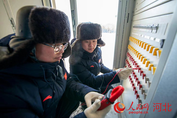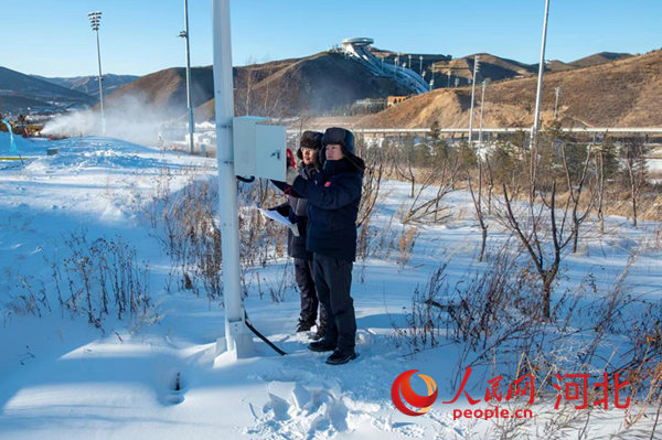 廊坊電力冬奧保障團(tuán)隊(duì)李小虎(右)和同事在國(guó)家越野滑雪中心賽道上檢查高壓配電室。 鄒明攝