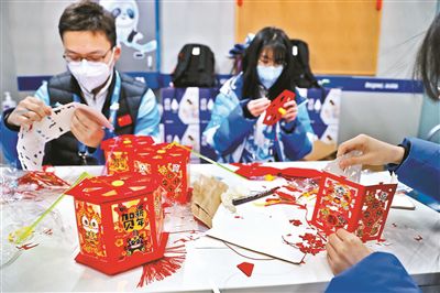 昨天是中國(guó)的傳統(tǒng)節(jié)日元宵佳節(jié),國(guó)家體育館開展了豐富多彩的慶?;顒?dòng),當(dāng)天場(chǎng)館餐廳提供了湯圓,場(chǎng)館禮賓部工作人員向外賓介紹中國(guó)吃湯圓的由來和寓意,并邀請(qǐng)大家品嘗。在志愿者之家內(nèi),彩燈高懸,充滿歡聲笑語(yǔ),志愿者們做燈籠、猜燈謎,共同度過一個(gè)歡樂祥和的元宵節(jié)。圖為冬奧志愿者在制作花燈。文并攝/本報(bào)記者 黑建軍