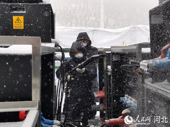 國家冬季兩項(xiàng)電力保障團(tuán)隊(duì)在暴雪中清理積雪,確保設(shè)備健康。 馬錚攝