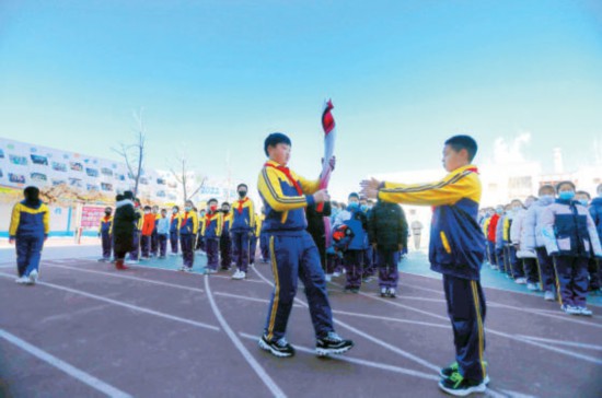 操場(chǎng)上,一場(chǎng)模擬火炬?zhèn)鬟f儀式開(kāi)始了。孩子們高舉火炬,神采奕奕。薛東說(shuō),這支火炬將入藏該校的“小小冬奧博物館”,成為該校冬奧教育的一部分。