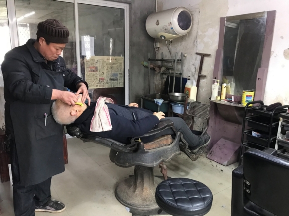 “推好了,來,再洗下,然后刮刮胡子?!?對話間,沈建平引導(dǎo)嚴(yán)老師到水池旁,用熱水沖洗了頭,然后請嚴(yán)老師躺到了另一張“古董”椅子上,繼續(xù)麻利地修面和刮胡子。