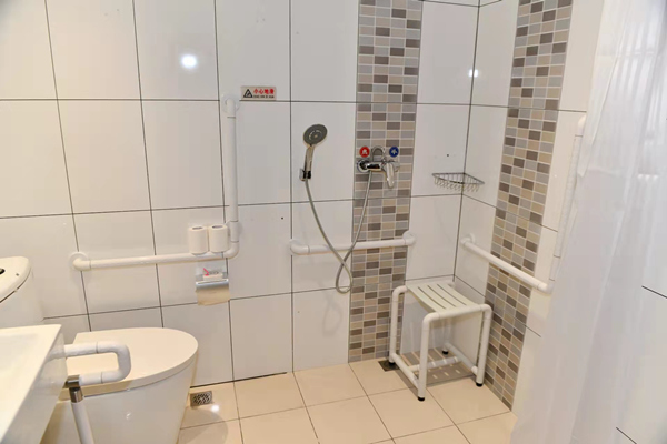 酒店前臺設(shè)置了低位服務(wù)臺,坐著就可以辦理入住登記等手續(xù)。進入電梯后,電梯按鈕上附有盲文,方便視力障礙人士使用;鏡面、扶手、語音播報一應(yīng)俱全。來到客房部,走廊平整開闊,鋪設(shè)了防滑地膠,客房的房門也進行了拓寬。進入客房內(nèi),低位開關(guān)、無障礙寫字桌、開放式衣柜等,讓人感覺溫暖、舒適。衛(wèi)生間里配備了各類無障礙設(shè)施,淋浴區(qū)一側(cè)的墻壁上裝有無障礙扶手,并配備了無障礙淋浴椅和寬大的浴室鏡等。低位洗手盆旁邊,是低位置物架,上面放著擦手巾。