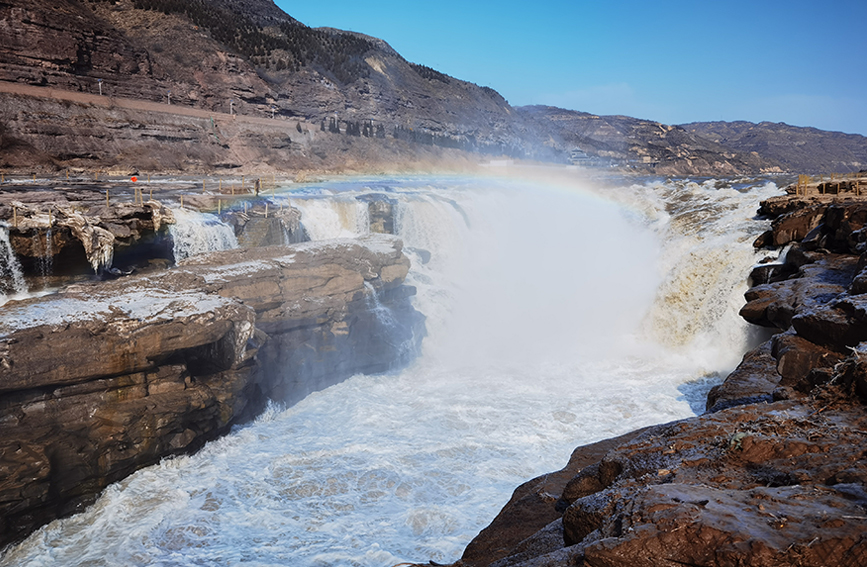 隨著氣溫回暖,冰凌融化,黃河壺口瀑布水量增大。飛流直下的瀑布激起大片水霧,在陽(yáng)光的照射下,瀑布上方出現(xiàn)了一道美麗的彩虹,呈現(xiàn)“彩虹飛渡”的奇觀。(譚飛 攝)