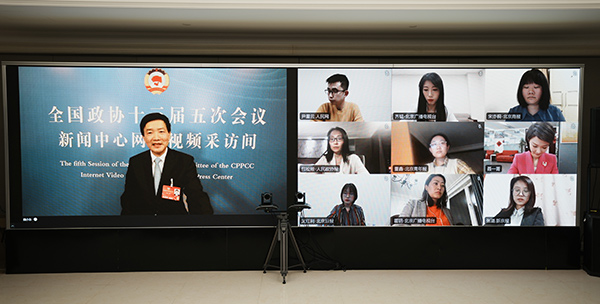 北京市政協(xié)主席魏小東通過云平臺(tái)接受集體采訪。(北京市政協(xié)供圖)