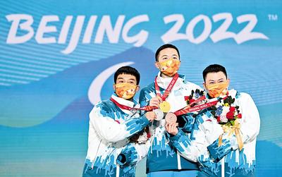 3月7日,北京冬殘奧會(huì)殘奧單板滑雪男子障礙追逐UL級(jí)比賽在云頂滑雪公園舉行,三位來自河北的“零零后”選手紀(jì)立家、王鵬耀、朱永鋼分獲金、銀、銅牌,取得了我國、河北省在冬殘奧會(huì)該項(xiàng)目的歷史性突破。當(dāng)晚該項(xiàng)目的頒獎(jiǎng)儀式上,3面五星紅旗同時(shí)升起,激動(dòng)人心。