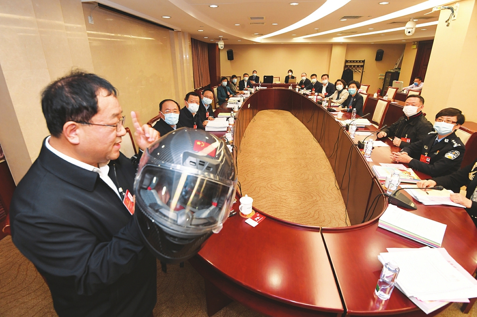 3月7日,山西代表團(tuán)舉行小組會議。呂春祥代表對政府工作報告提出的“今年深入實施創(chuàng)新驅(qū)動發(fā)展戰(zhàn)略”深感振奮,對“推進(jìn)科技創(chuàng)新,促進(jìn)產(chǎn)業(yè)優(yōu)化升級,突破供給約束堵點,依靠創(chuàng)新提高發(fā)展質(zhì)量”充滿信心。他展示了其所在的中科院山西煤化所和山西鋼科碳材料有限公司碳纖維聯(lián)合團(tuán)隊研發(fā)的TG800碳纖維材料,這一材料應(yīng)用于雪車頭盔,成為今年北京冬奧會上亮眼的山西名片。(記者李聯(lián)軍攝)