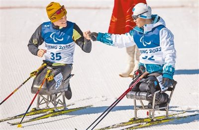 3月8日,在北京冬殘奧會(huì)殘奧冬季兩項(xiàng)男子中距離坐姿組比賽后,中國(guó)代表團(tuán)運(yùn)動(dòng)員劉夢(mèng)濤(右)與德國(guó)代表團(tuán)運(yùn)動(dòng)員馬丁·弗萊格相互致意、共同慶祝。