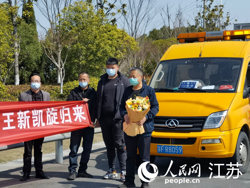 王新所在村村干部及志愿者歡迎王新蘇州戰(zhàn)疫歸來(lái)。人民網(wǎng)記者 王繼亮攝