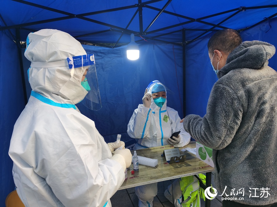 2月27日一早6點(diǎn)多,在吳江區(qū)松陵街道水秀社區(qū),王新(中)為前來(lái)采樣的市民登錄個(gè)人信息。人民網(wǎng)記者 王繼亮攝