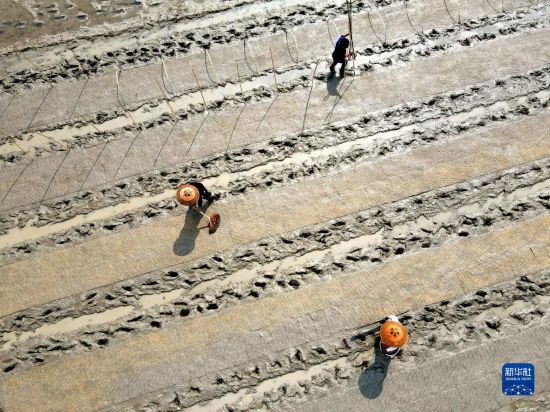 3月13日,在湖南省婁底市雙峰縣井字鎮(zhèn)花橋村,農(nóng)民在秧田勞作(無(wú)人機(jī)拍攝)。