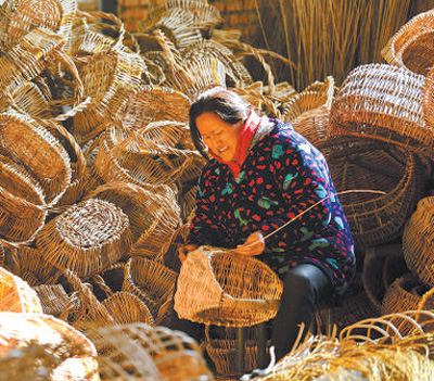 2021年12月28日,安徽省阜陽市阜南縣郜臺(tái)鄉(xiāng)劉店村農(nóng)戶在“柳編巷”內(nèi)加工編織工藝品。